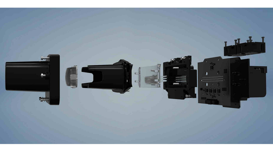 von 4: Auch bei Scheinwerfern setzt Magna auf eine wachsende Zahl von Dioden. Hier der ADB60-Scheinwerfer mit drei Reihen von je 20 Lichtpunkten.