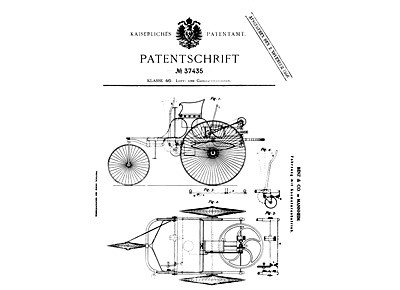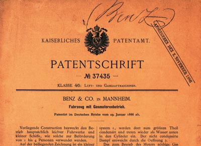 von 7: Am 29. Januar 1886 erhielt Carl Benz unter der Nummer 37435 das deutsche Patent auf sein Motorfahrzeug.