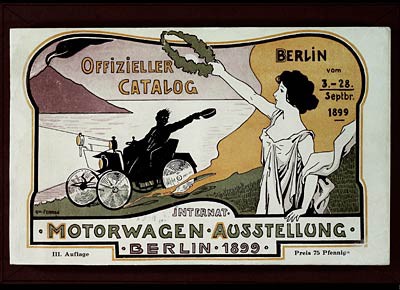 von 7: International: 1899 fand in Berlin (Exerzierhalle, Karlstraße) die erste Motorwagen-Ausstellung mit länderübergreifendem Anspruch statt. Titelseite des Katalogs.