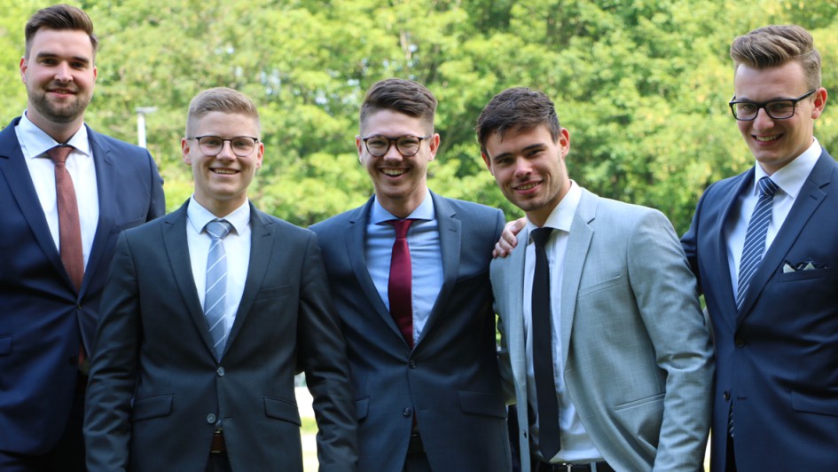 von 9: Erstmalig wurden in diesem Studienjahr sechs Stipendien à 7.000 Euro von MAN Truck & Bus Deutschland vergeben. Im Bild (v. l. n. r.): Claudia Barca, Regionalleitung Human Resources MAN, Vertriebsregion Südost, die Stipendiaten Leon Gansler, Marvin Hautmann, Tim Weist, Elisa Sievers, Christina Hecker, Elyane Becker sowie Patrick Golder, Vertriebsdirektor Region Südost MAN.