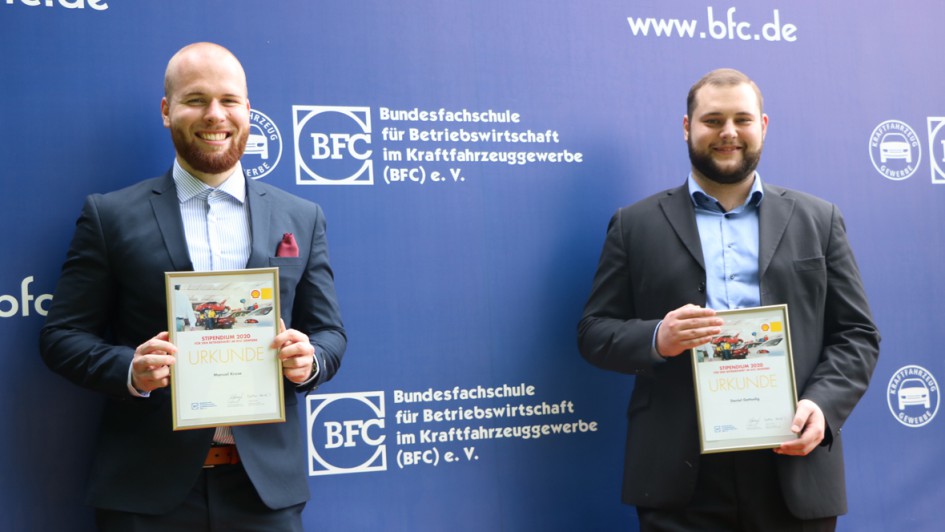 von 9: Die Shell Deutschland Oil wiederum hat zum zweiten Mal zwei Stipendien vergeben. Maßgeblich hierfür war eine Ausarbeitung zum Thema "Das klimafreundliche Autohaus – Potenziale zur CO2-Einsparung in Autohaus und Werkstatt". Manuel Kruse (l.) und Daniel Gottselig haben mit ihren Ideen wie "Green Service, CO2-Handprint und einem grünen Mobilitätscenter" überzeugt.