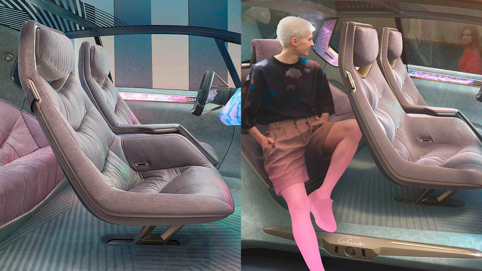 von 8: Innen sieht der Vision Circular wie eine Designer-Lounge mit Möbeln von Bretz aus. Die außen angeschlagenen Türen und der Verzicht auf eine B-Säule sorgt für einen besonders großzügigen Einstieg ins Innere.