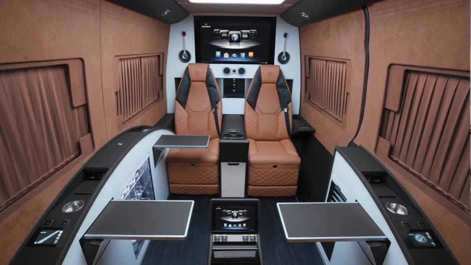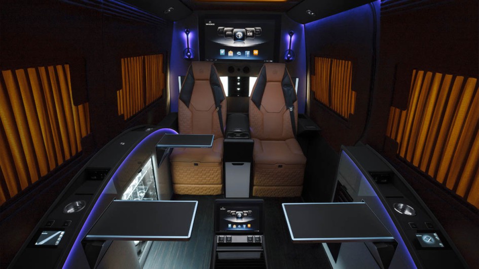 von 6: Der Mercedes Sprinter ist ein Multitalent. Dass der Transporter nicht nur als Arbeitstier für die Baustelle taugt, will Brabus beweisen und stellt diesen nun als Business-Lounge-Variante aus.