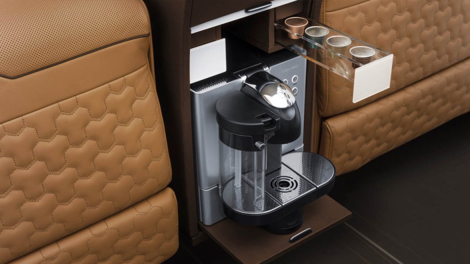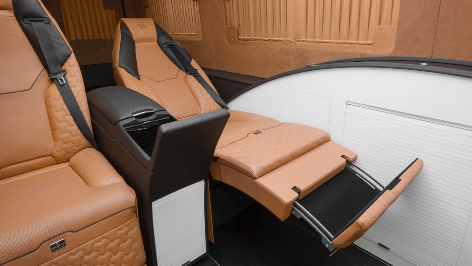 von 6: Die Business-Sitze aus Leder in braunen Farbtönen bieten mit Massagefunktion, Heizung und speziellen Rückenstützen Komfort für die Fahrt und lassen sich auch in Schlafposition bringen.