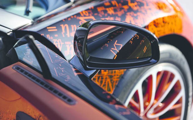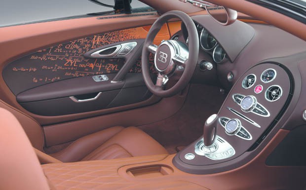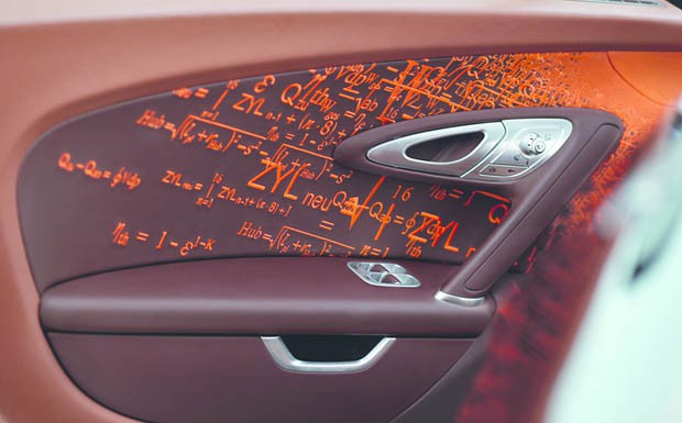 von 7: So wurden technische Formeln zur Errechnung der Leistungskraft des Bugatti-Motors auf der Karosserie des Autos angebracht und auch in der Interieurgestaltung aufgegriffen.