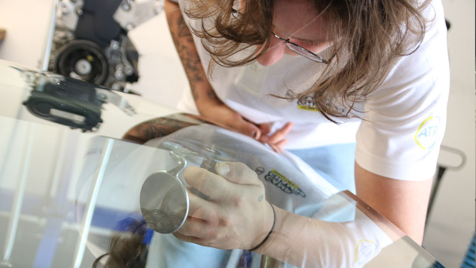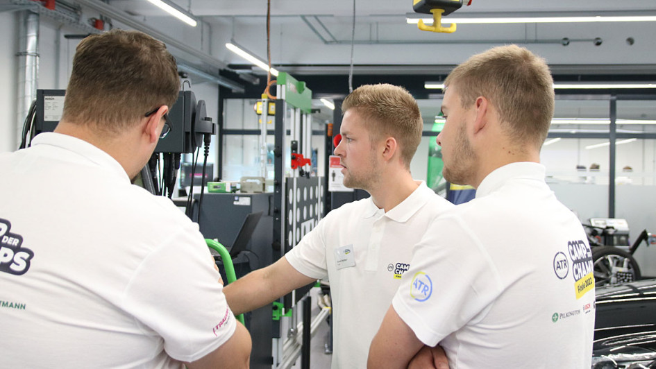 von 9: Sieger Jorrit Kirchenknopf, Hansewerkstatt Hamburg GmbH (Mitte), Tobias Schulz, Brinkmann Vorpommern GmbH (links), kam auf Platz zwei und Christoffer Schauberer, Design & Fahrzeuglackierung Berben GmbH / Meisterhaft Autoreparatur, sicherte sich den dritten Platz.