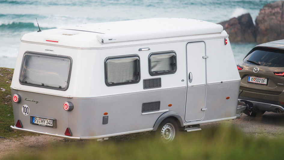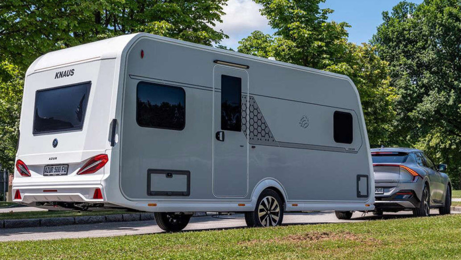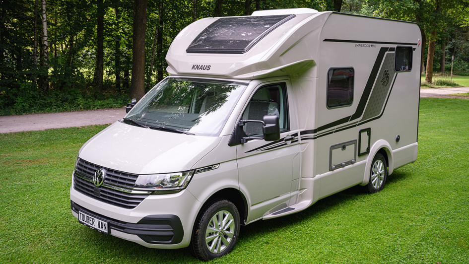 von 30: Der Knaus Tourer CUV fällt allein schon wegen seiner "Elvis-Tolle" über dem Fahrerhaus auf, die auf das selbst entwickelte Hubdach zurückzuführen ist.