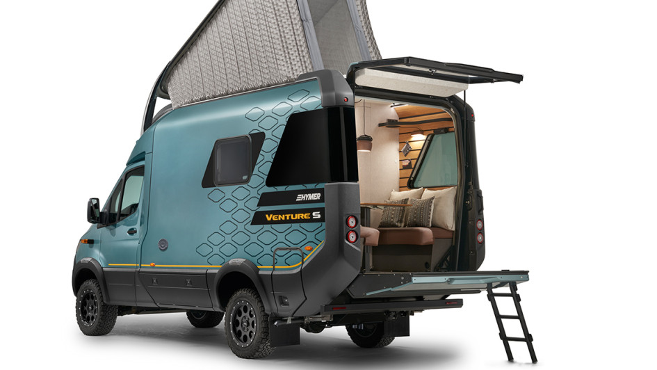 von 30: Der Hymer Venture S ist ein exklusives Fahrzeug, dessen Grundpreis bei stolzen 225.000 Euro liegt. Der Clou ist die zweigeteilte Heckklappe, deren unterer Teil als privates Sonnendeck in Yachtoptik ausgelegt ist.
