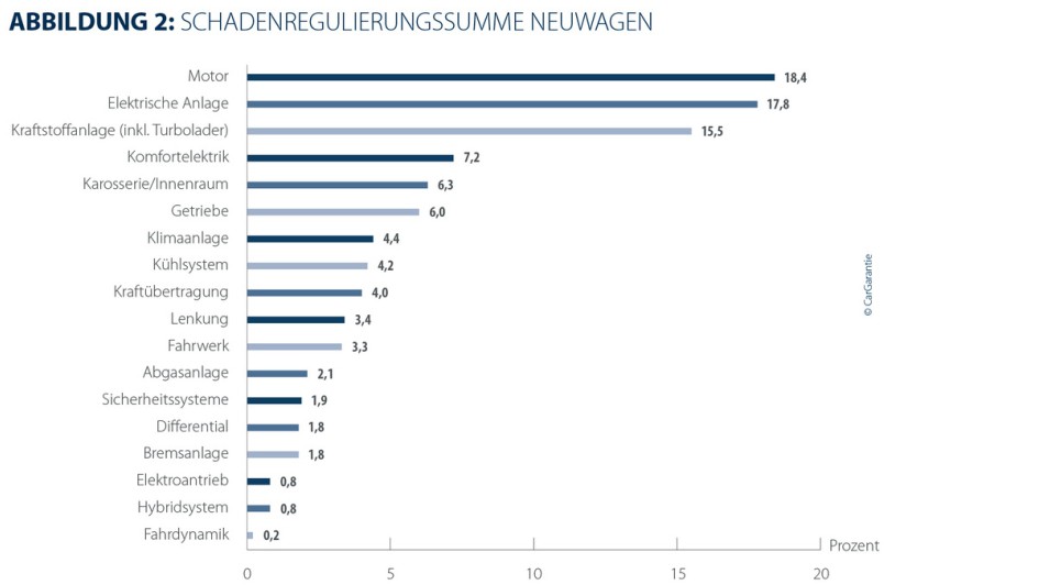 von 6: Bei Neuwagen liegt der Motoranteil bei 18,4 Prozent, die elektrische Anlage folgt mit 17,8 Prozent, während die Kraftstoffanlage 15,5 Prozent der Reparaturkosten ausmacht.