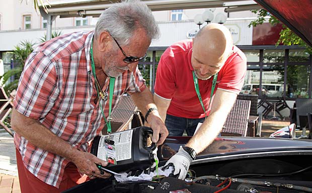 von 19: Letzte Wartungsarbeiten: Maximilian Bobnar, M.B. Sport-Cars, hat den zu trockenen Kühler des Alfa Romeo 2600 Spider von 1963 glücklicherweise noch rechtzeitig bemerkt. Es assistiert der Tour-Techniker Dieter Hofbauer.