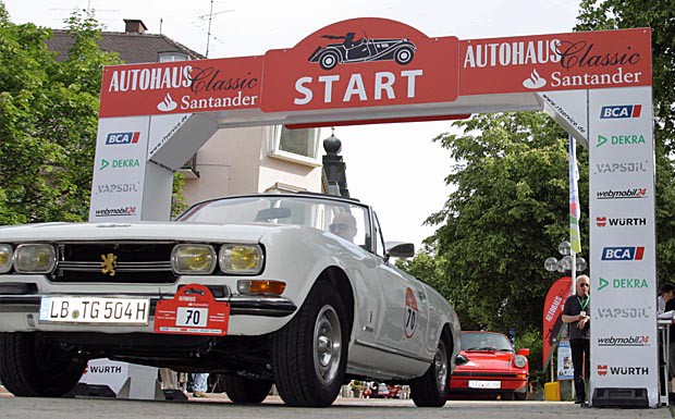 von 19: Letzte Instruktionen: Marion Johl, Santander Consumer Bank, klärt mit Tour-Chefin Juliane Schleicher noch die letzten Fragen. Sönke Roggenbuck am Steuer und Co-Pilot Jascha Bräuer sind dagegen schon abfahrbereit und bekommen von AUTOHAUS Redakteur Christian Merten die Rallye-Karte gereicht. Unterwegs sind beide mit einem Ford Mustang Cabrio von 1967.