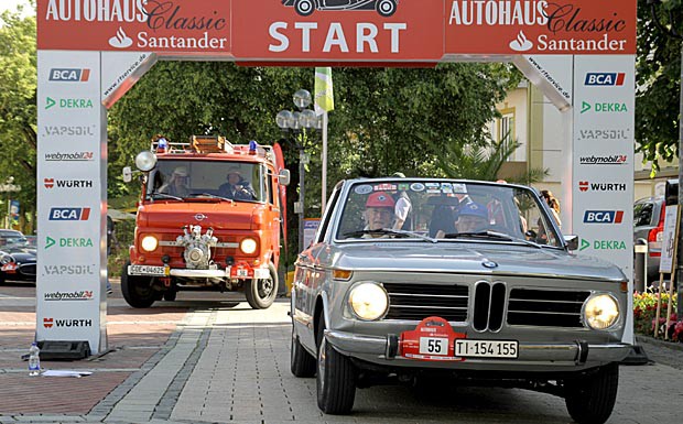 von 19: Und die Feuerwehr fährt hinterher: Franca und Hansludwig Fritzsche, Garage Rivapiana, haben das Opel Blitz Löschfahrzeug von 1972 immer im Blick – wenn sie ihm in ihrem BMW 2002 Baur Cabrio von 1971 nicht kurzerhand davon fahren.