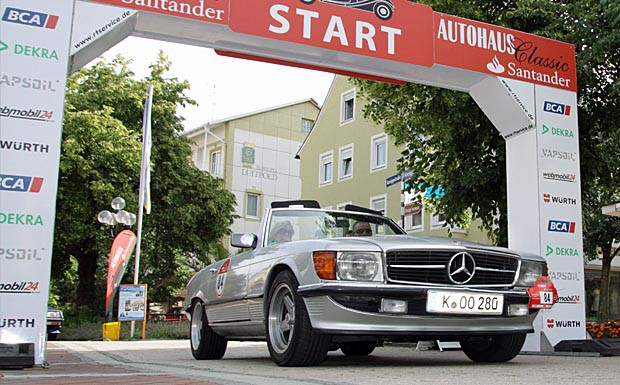 von 19: Andrea Droemont und Caspar Löfken, Autohaus Löko, starten in ihrem Mercedes-Benz 280 SL von 1982 ganz elegant in den ersten Tourtag.
