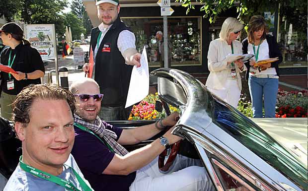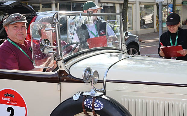 von 19: Genaue Kontrolle muss sein: Susanne Schwarzenböck und Christian Merten vom AUTOHAUS Rallye-Team kontrollieren Team Nr. 2, die mit einem Ford Modell A von 1930 auf die Tour gehen. Pilot ist Jörg Hönigk, Auto-Hönigk, begleitet von Co-Pilot Thomas Löszu