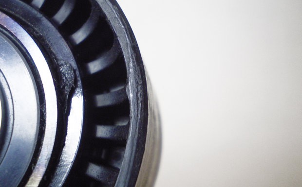 Die Umlenkrolle wird durch einen unzulässigen Kontakt mit der Verkleidung blockiert und fällt durch den darüber gleitenden Riemen nach kurzer Laufzeit aus.