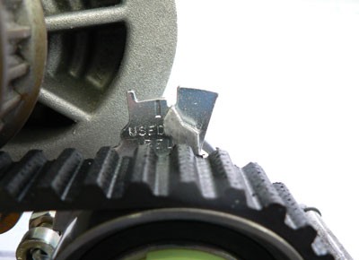 Drehen Sie die Kurbelwelle nach rechts, bis die Steuermarkierung der Kurbelwellen-Riemenscheibe mit der Spitze am Motorblock fluchtet.Bei Nockenwellenrädern mit einfachen Steuermarkierungen: Prüfen Sie, ob die Steuermarkierungen des Nockenwellenrades mit den Markierungen des Ventildeckels fluchten.