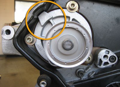 Hinweis: Beim Einbau der Wasserpumpe ist auf den Sitz der Wasserpumpe zu achten. Die Nase der Wasserpumpe muss in die Aussparung der hinteren Zahnriemenverkleidung geführt werden.