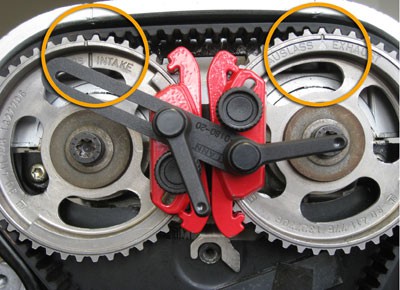 von 7: Bei Nockenwellenrädern mit doppelten Steuermarkierungen: Prüfen Sie, ob die Steuermarkierung „INTAKE“ (Einlassseite) und „EXHAUST“ (Auslassseite) mit den Markierungen des Ventildeckels fluchten.
