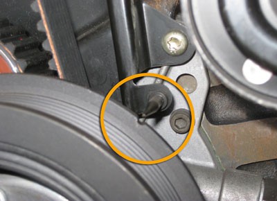 Kurbelwellenschraube ausbauen und die Schraube der Spannrolle lösen.