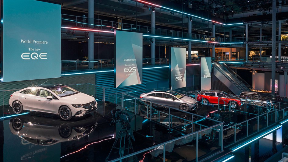 von 7: Eine wichtige Rolle kommt dem Mercedes EQE zu, dessen Serienvariante in München erstmals zu sehen ist. Bis zu 660 Kilometer weit soll der elektrische Cousin der E-Klasse kommen.