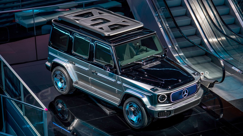 von 7: Das Concept EQG trägt die bekannten Designzüge mit kantiger Karosserie, kommt aber statt mit Diesel oder Benziner mit gleich vier E-Motoren daher – je einer pro Rad, was für einen besonders variablen Allradantrieb sorgen dürfte.