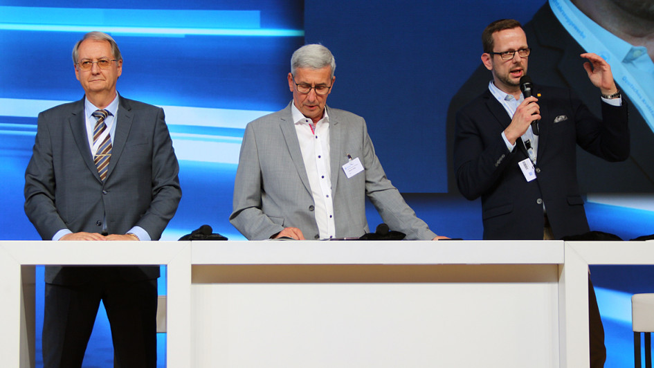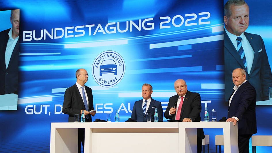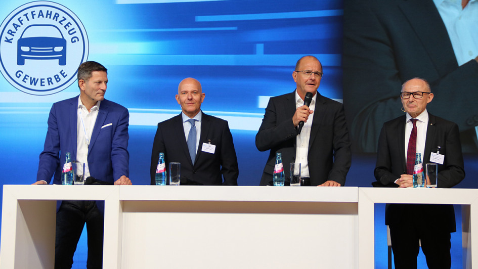 von 9: Das Präsidium des Zentralverbandes Deutsches Kfz-Gewerbe (ZDK) beantwortete die Fragen des Publikums (v.li.): Hauptgeschäftsführer Axel Koblitz, Vizepräsident Thomas Peckruhn, Präsident Jürgen Karpinski und Bundesinnungsmeister Detlef Peter Grün
