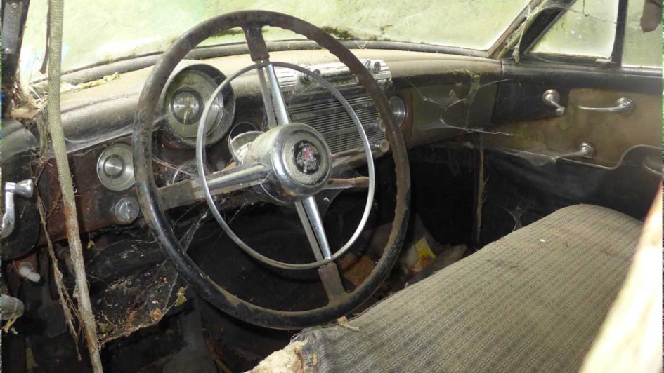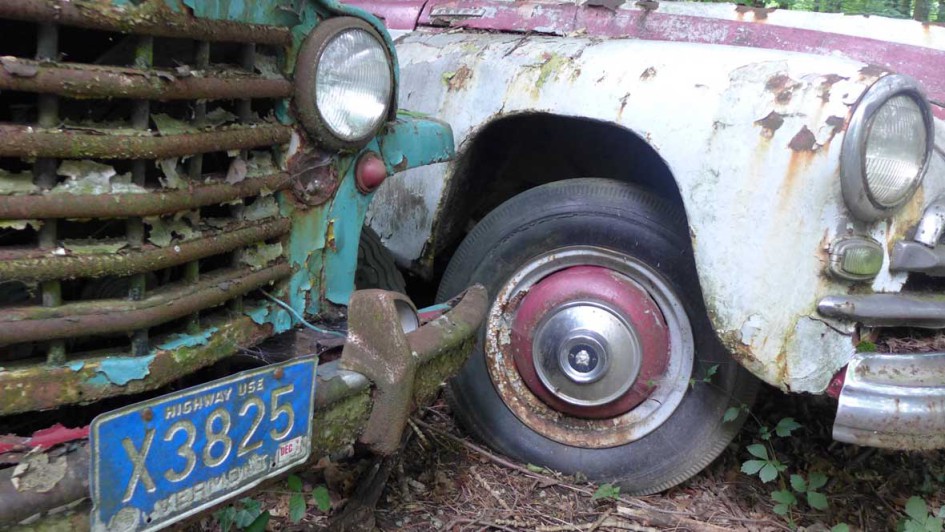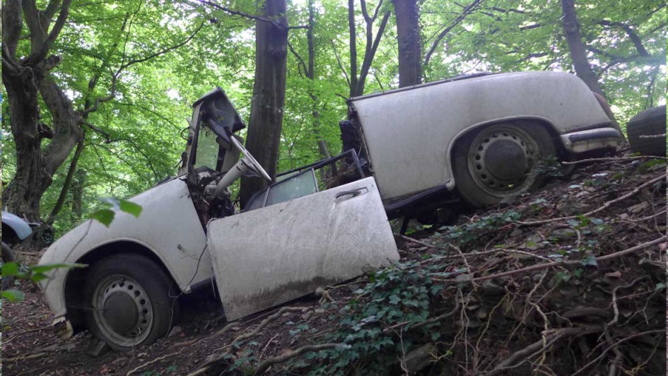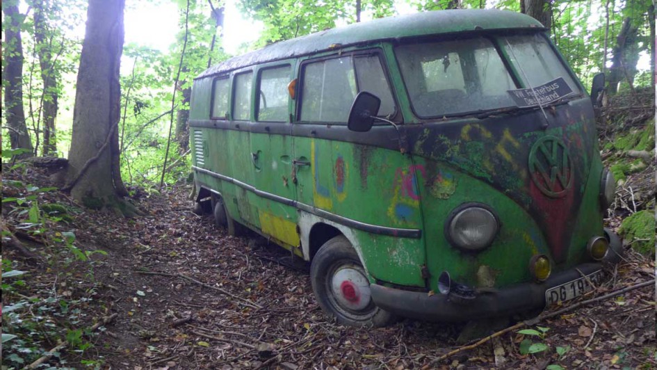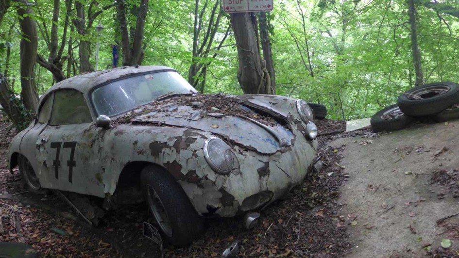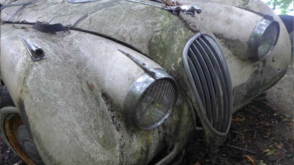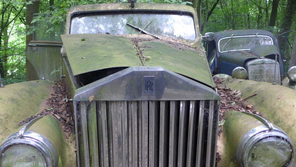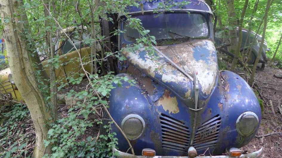 von 10: Schwere Äste drücken an manchen Stellen auf die dünne Blechhaut der Oldies, trübe Scheinwerferaugen schielen den Betrachter an oder hängen weit aus den Höhlen.