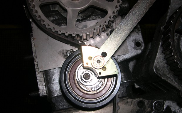 von 10: Spannrolle mit zwei Loch Schlüssel (OE 3387, oder aus der Conti Tool Box) gegen Uhrzeigersinn entspannen. Jetzt den Zahnriemen Kurbelwellen- und Nockenwellenrad dürfen ohne montierten Zahnriemen niemals einzeln gedreht werden (Motorschaden).