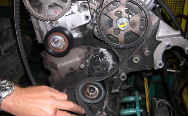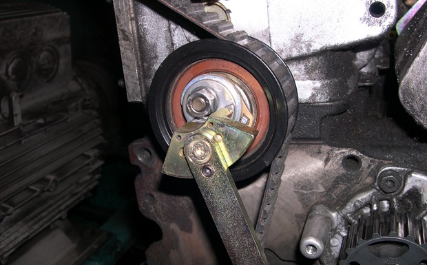 von 10: Hier kommt nun ein sehr wichtiger Schritt bei der Spannungseinstellung des Zahnriemens, denn vei fehlerhaftem Vorgehen kann es zum baldigen Ausfall der Spannrolle durch Unterspannung des Riementriebes kommen. Vorgehensweise: Das Nockenwellenlineal einsetzen. Blockierwerkzeuge einsetzen. Zahnriemenspannung erneut ggf. mit einem Spiegel an der Spannrolle ablesen. Markierungen an der Spannrolle müssen sich unbedingt decken (Abb. 10). Ggf. nachstellen und erneut nach 2 weiteren Motorumdrehungen wieder im gleichen Prozess wie oben prüfen. Weiterer Einbau in umgekehrter Reihenfolge des Ausbaus.