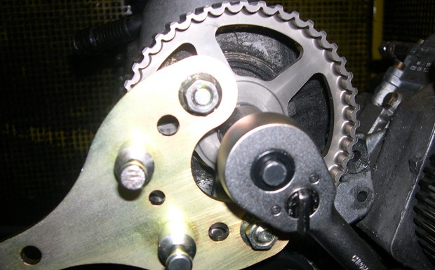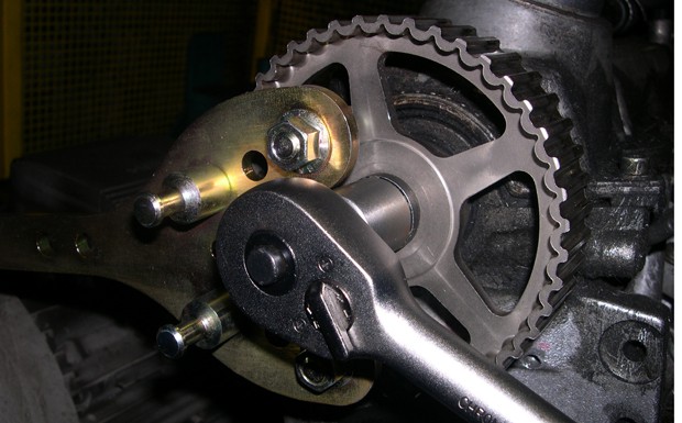 von 10: Einbau: Den Gegenhalter (OE 3036 oder aus der Conti Tool Box) in das NW-Rad einsetzen. Die Schraube zunächst nur einige Gewindegänge lösen. Jetzt ggf. einen Abzieher am Nockenwellenrad ansetzen und das Rad abdrücken (OE T-40001 oder Uni-Werkzeug).