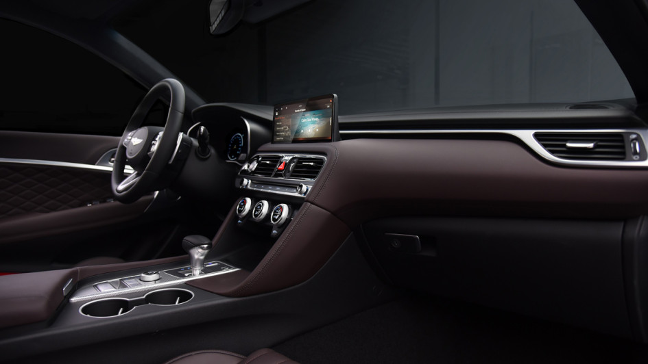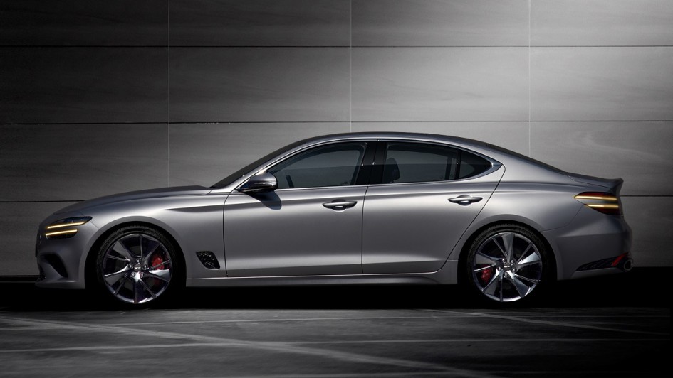 von 4: Hyundais Nobelableger Genesis hat erste Bilder seiner nach drei Jahren Bauzeit gelifteten Mittelklasse-Limousine G70 veröffentlicht. Die Front des G70 trägt nun zweigeteilte Quad-Scheinwerfer wie auch einen diamantförmigen Kühlergrill mit Wabengitterstruktur.