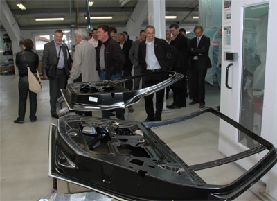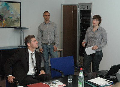 von 11: Die Esslinger Studenten Valerie Neuffer und Florian Preiss (Mitte) stellten aktuelle Studieninhalte vor (links im Bild: Norbert Schreier, Leiter des Studienschwerpunkts Fahrzeugtechnik-Service)