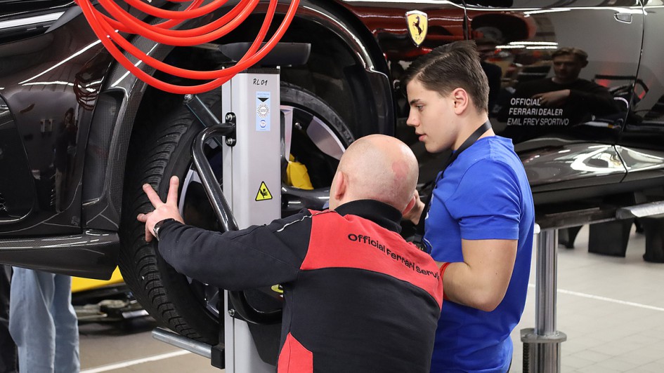 von 10: Bereits zum zweiten Mal haben die 13 Ferrari-Vertragshändler in Deutschland und Österreich potenzielle Nachwuchskräfte eingeladen, um praxisnahe Einblicke in die Abläufe von Autohaus und Werkstatt zu ermöglichen. AUTOHAUS war beim Ferrari Zukunftstag im Betrieb von Emil Frey Sportivo in München dabei.