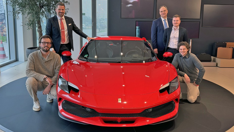 von 10: V.l.n.r.: Emanuel Klotz (Ferrari Central Europe), Ralf Fischer (Emil Frey Sportivo), Thomas Mych (Emil Frey Sportivo), Constantin Faust (Ferrari Central Europe) und Stefan Schmid (AUTOHAUS)