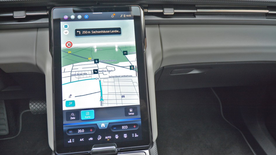von 14: Auch der neigbare und vertikale Screen überzeugt, wenngleich das eine oder andere Icon durchaus etwas größer ausfallen dürfte, um es während der Fahrt leichter aktivieren zu können.