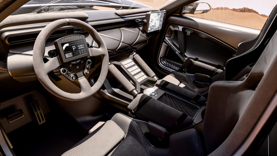von 3: Antrieb ist ein V8-Motor, der 1.115 PS und 1.152 Newtonmeter Drehmoment auf alle vier Räder verteilt. Tragende Basis ist ein leichter Rohrrahmen, der einen Überrollkäfig integriert.