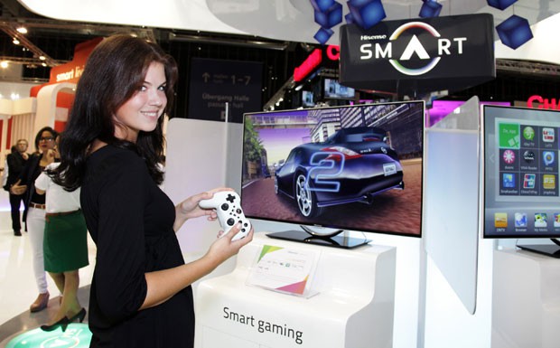 von 22: Auch das Thema Computerspiele stand wieder hoch im Kurs. Im Bild präsentiert eine Hostess digitales Autorennen unter dem Motto "Smart Gaming" (zu deutsch: "Clever spielen" - Foto: Messe Berlin GmbH)