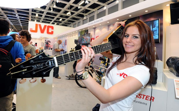 von 22: Das Standpersonal von Elektronikspezialist JVC widmete sich Elektro und Rock. Dafür packte man sowohl die Tanzschuhe als auch die Gitarrre aus: Nachdem sich das Breakdance-Kollektiv "DaRookies" von seiner besten Seite zeigte, durfte die Dame im Bild in die Saiten greifen (Foto: Messe Berlin GmbH)