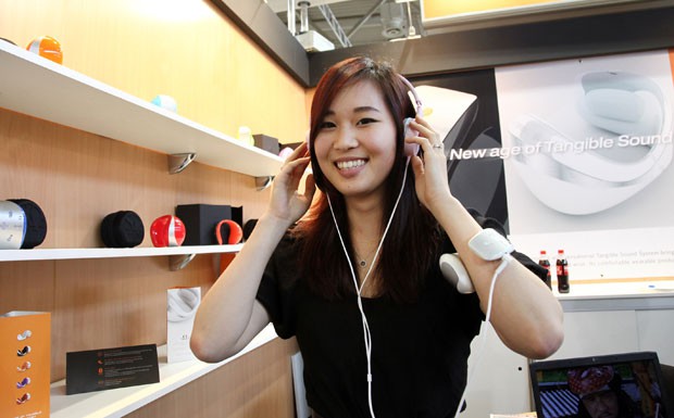 von 22: Kopfhörer ohne Kabelsalat sind das Gebot der Stunde. Wie das geht, zeigten sogar die Messegirls vom Beko-Stand. Eigentlich verdient das Unternehmen sein Geld eher im Bereich Haushaltsgeräte (Foto: Messe Berlin GmbH)