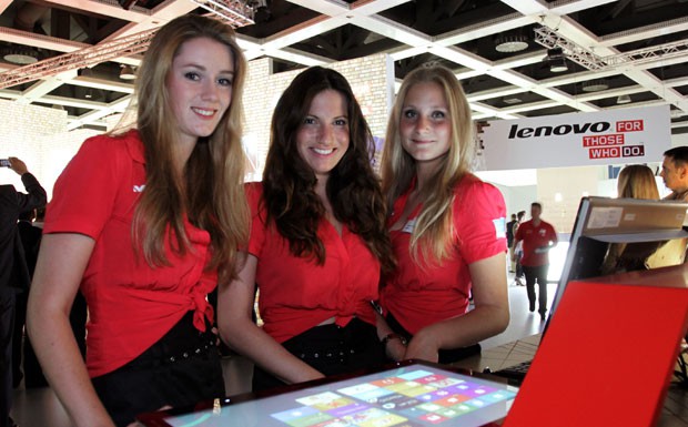 von 22: Der zweitgrößte Compterkonzern Lenovo hat sich vor einem Jahr die Aldi-Hausmarke Medion einverleibt. Das weibliche Marketingpersonal repräsentierte einträchtig Marke und Mutterkonzern auf dem IFA-Stand (Foto: Messe Berlin GmbH)