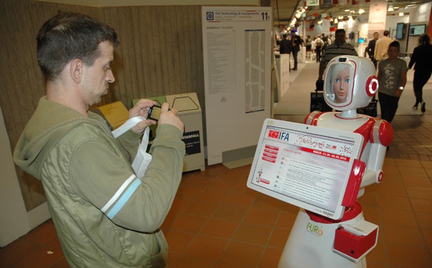 von 22: Die Messehostessen der Zukunft stellten sich in Berlin ebenfalls schon vor. Die rollende Roboterdame "Furo" zeigte isch ebanfalls äußerst fotogen (Foto: asp)