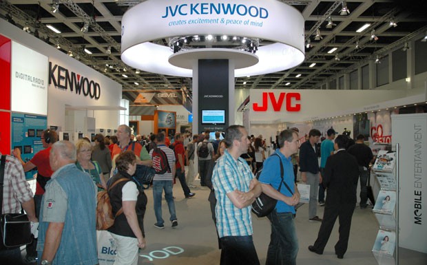 von 15: Seit 2008 ein Team: Der gemeinsame Messestand der japanischen Marken JVC und Kenwood war gut besucht. Neben den Highlights DAB+ und Head-up-Display lockten u.a. der Auftritt einer Berliner Breakdance-Gruppe und die "Action-Cam" von JVC, einer robusten Kamera, mit der eigene sportliche Leistungen gefilmt werden können.