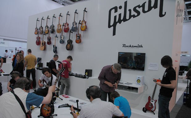 von 15: Der Hersteller von Elektrogitarren Gibson präsentierte sich in Berlin auf einem interaktiven Messestand, der zum Mitmachen animieren sollte. Und in der Tat, viele Profi- und Hobbygitarristen trafen sich zum gemeinsamen oder individuellen "jammen".