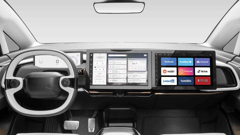 von 5: Das Cockpit des Indi One verzichtet weitgehend auf Knöpfe und Schalter. Stattdessen gibt es einen großen Touchscreen zentral im Armaturenbrett, der von zwei weitere Displays flankiert wird.