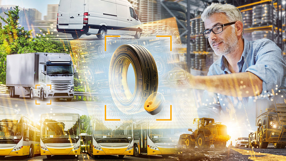 von 34: Modernes digitales Reifenmanagementsystem für Flottenbetreiber, das die Überwachung der Reifenzustände erleichtert: Druck und Temperatur werden von Sensoren im Inneren der Reifen erfasst, in Echtzeit an eine Cloud bei Continental übertragen und kontinuierlich analysiert.