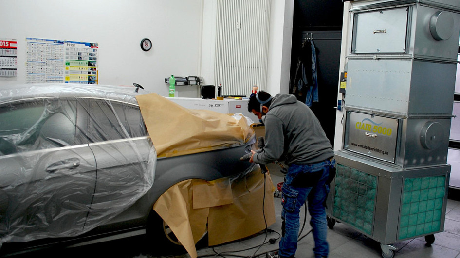 von 34: Fahrbares Absaug- und Luftreinigungssystem für kleine Lackierarbeiten (Spotreparaturen) in Werkstätten ohne separate Lackierkabine. Die Absauganlage wird direkt an das zu reparierende Fahrzeug herangefahren, um den beim Spritzen entstehenden Farbnebel abzusaugen.