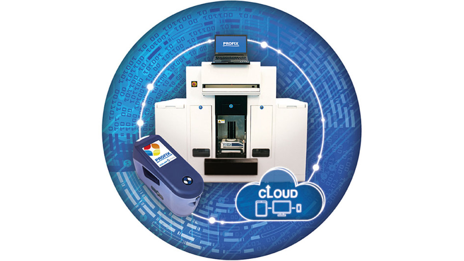 von 34: System zur Bestimmung und Mischung der korrekten Lackfarbe bestehend aus drei Komponenten: Einem handlichen Spektrometer, das auf die Lackoberfläche des Fahrzeugs aufgesetzt wird, um die Lackfarbe zu bestimmen. Einer cloudbasierten Expertendatenbank, die aus den Spektrometerdaten die Lackrezeptur errechnet und der hochpräzisen Dosiermaschine MCMIX, die den Lack innerhalb von zwei Minuten anmischt.