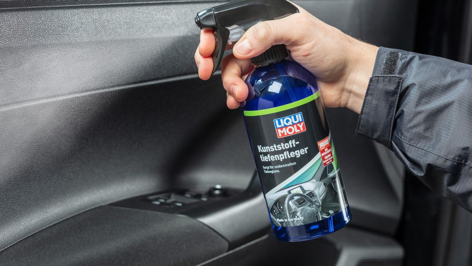 von 6: Kunststofftiefenpfleger: Insbesondere für die Einstiegsleiste von Fahrzeugen eignet sich der Kunststofftiefenpfleger. Oftmals bleiben in der Tür helle Flecken zurück, wenn durch Schuhe verursachte Schlieren entfernt werden. Das Produkt dringt tief ins Material ein und frischt die Kunststoffe wieder auf. Zurück bleibt eine saubere Einstiegsleiste mit seidenmattem Glanz.