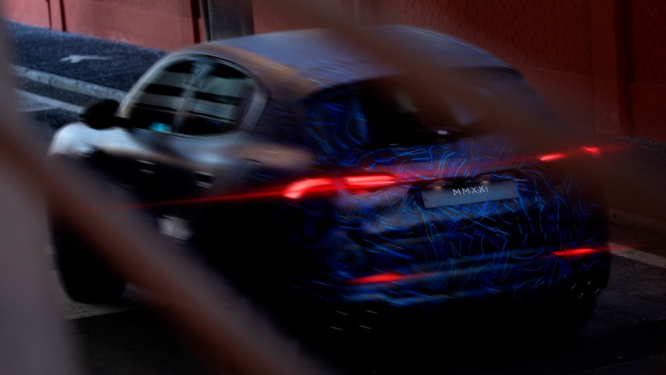 von 4: Gewollt unscharf: Maserati hat erste Bilder des neuen SUV-Modells Grecale veröffentlicht. Trotzdem lassen sich einige Details erahnen. In der Front deuten sich große Luftöffnungen und LED-Scheinwerfer an.