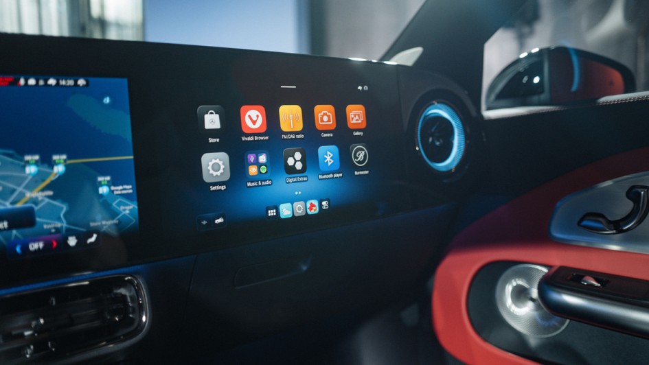 von 16: Hinter der Glasfläche sitzen der 26 Zentimeter (10,25 Zoll) große Bildschirm für Fahrerin/Fahrer und das 35,6 Zentimeter (14 Zoll) große Zentraldisplay.